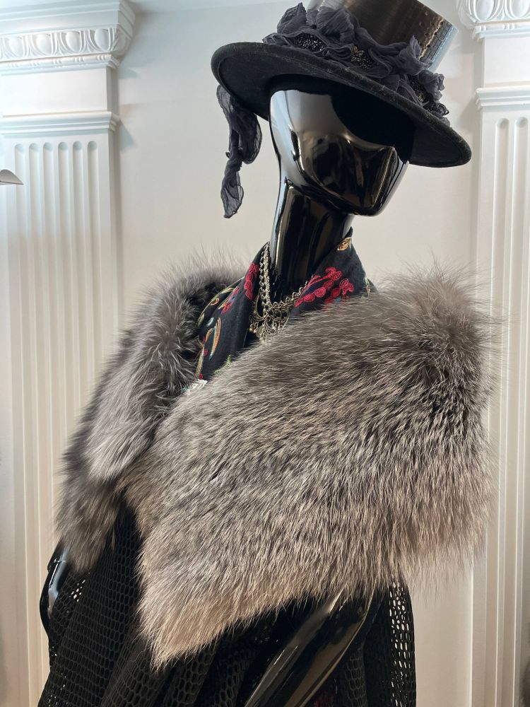 Накидка из лисы с длинным остевым волосом на шелковой подкладке. Накидка застегивается на крючки, садится по плечам.