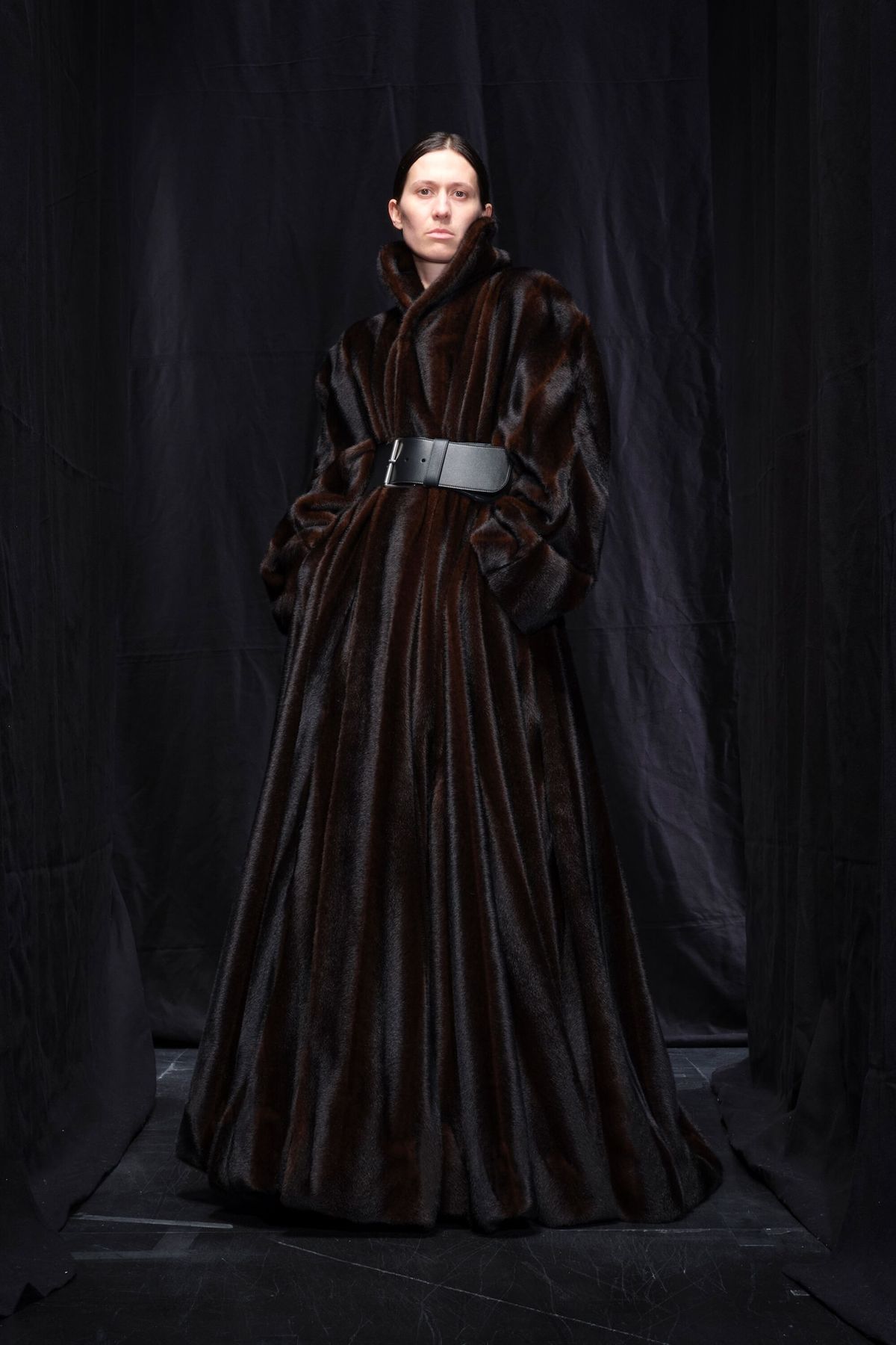 Гибридность. Слияние двух классических форм рождает узнаваемый, но свежий образ — строгий силуэт плаща, скрывающий роскошное наполнение. Акцент на талии подчеркивает стройность.